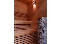 O vytápění sauny se starají saunová kamna Harvia Cilindro PC90, která mají tvar válcového koše, do kterého se vejde až 80 kg saunových kamenů. Nejen díky tomuto množství lze regulovat povahu saunování. Poléváním konkrétní části kamen lze ovládat prudkost odpaření vody. Kameny v horní části pilíře se totiž zahřívají na vyšší teploty než v nižší části, což ovlivňuje rychlost a intenzitu odpařování. Saunová kamna jsou vyráběna výhradně z nerezavějících kovů. Tento model je vhodný k častějšímu polévání vodou a jsou ovládány přímo na plášti.
