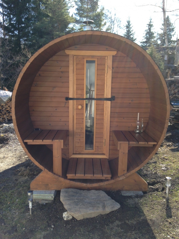 Sauna je vyrobená z termoborovice, potní místnost je ideální na ležení dvou osob či sezení pro 4, sauna je zezadu osazená kulatými okýnky, přední část je dopněna odpočívací verandou. Kamna Harvia M3 se postarají o vytopení sauny za 40 minut, skleněný průhled v kamnech se postará o atmosféru. Do sauny není přivedeno světlo, to zajišťuje kromě průhledu v kamnech petrolejka, aby se sauna co nejvíce blížila formátu tradiční finské sauny.